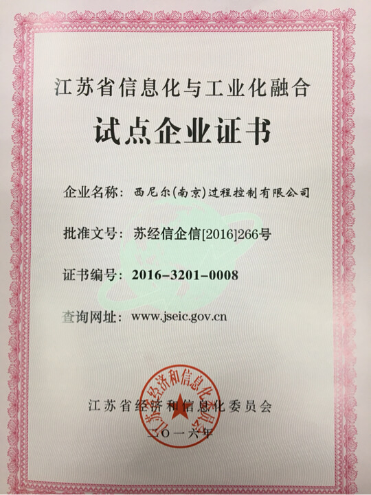 江蘇省信息化與工業(yè)化融合試點(diǎn)企業(yè)證書